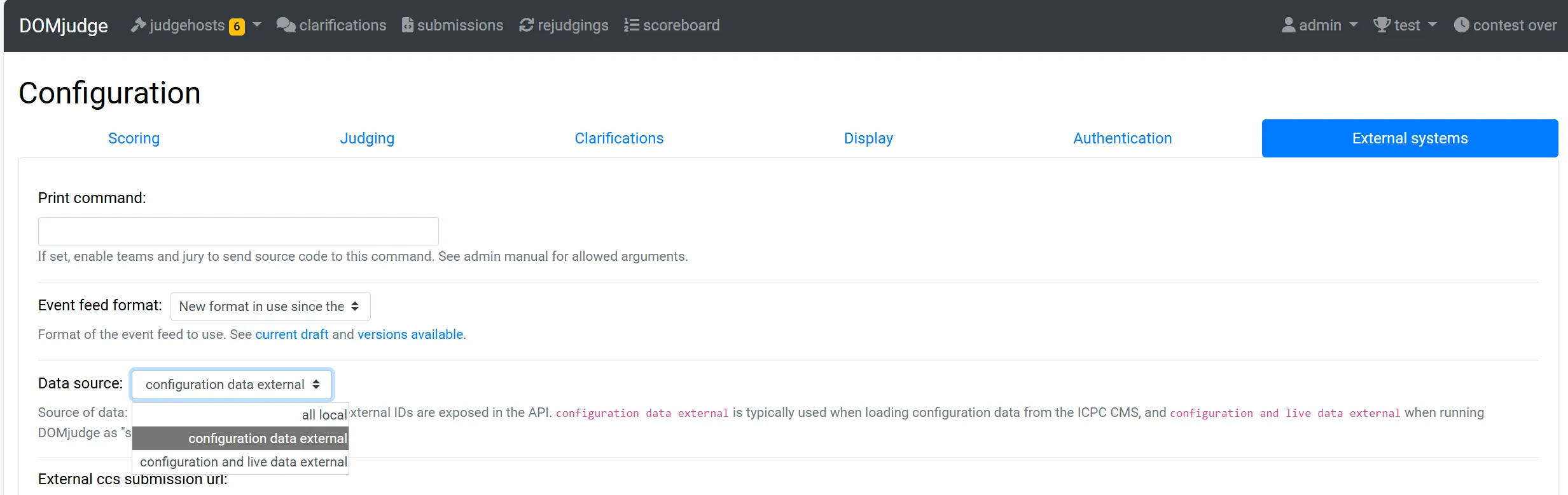 请在 domjudge 部署后将配置这里的 Data source 切换为 external,因为据说不切换会有很多锅?(因为数据库里面有自己的自增的整数主键 id 值,然而我们在导入用户信息的 id 却是手动设置的(而且一般都是字符串),如果我们想使用自己设置的 id,应该是对应 external id (我猜测的,如果 id 不对,那这个项目肯定就会出问题了))